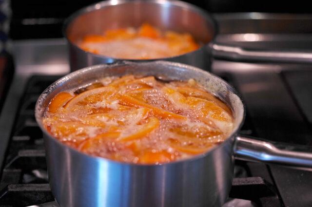 Es importante sumergir la cáscara de mandarina en el jarabe burbujeante, para que la cáscara de los cítricos retenga su elasticidad y no se agria.