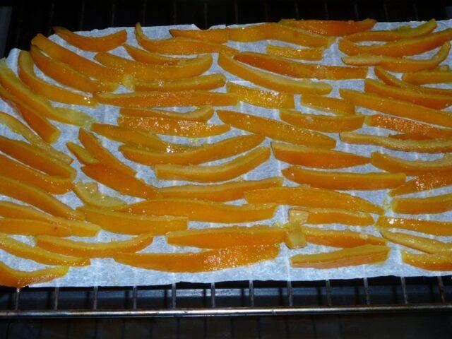 Los trozos de cáscara se retiran de la sartén con unas pinzas de cocina, se colocan sobre una rejilla de alambre y se dejan escurrir. Las frutas confitadas se secan a temperatura ambiente durante dos días.