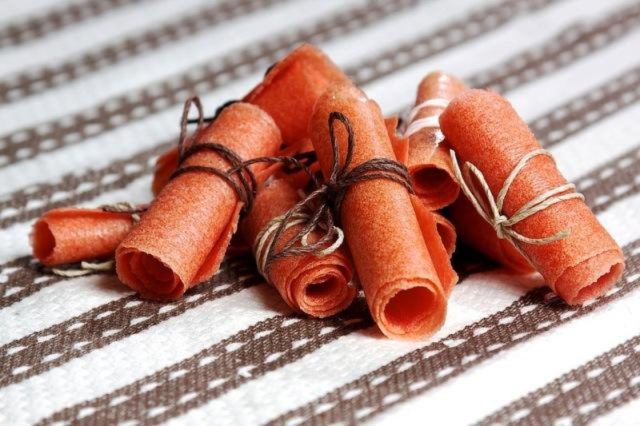 Las pastillas de calabaza cocidas en una secadora eléctrica se almacenan de la misma forma que se secan en el horno o al sol. El postre fragante se puede cortar en tiras colocando pergamino entre los platos. O enrollarlo en pequeños tubos. A los niños les encanta comer en la última versión.