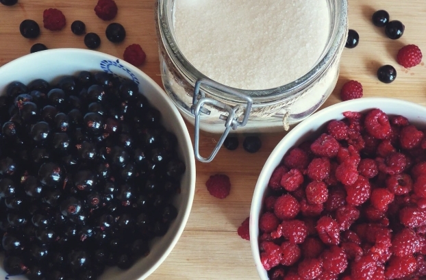 Ingredientes para la mermelada de grosella negra y frambuesa
