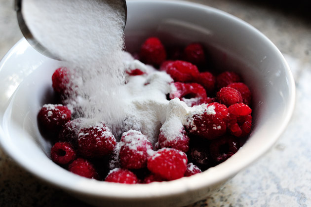 - Levanta el colador a vaso de agua, cubre las frambuesas peladas con azúcar granulada y deja reposar por 4 horas o toda la noche. Durante este tiempo, las bayas liberarán una gran cantidad de jugo.