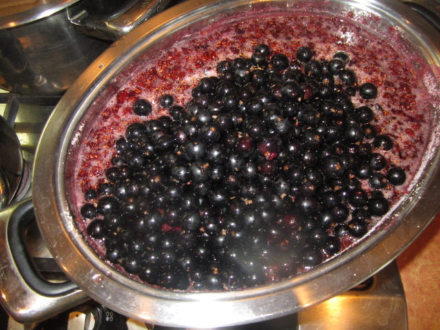 - Ponga a hervir las grosellas en un recipiente de acero inoxidable a fuego lento, eliminando las dulces y sabrosas espumas. Cocine la mermelada aromática durante 5 minutos para que la masa no hierva y hierva. Durante la ebullición, no es necesario revolver todo constantemente.