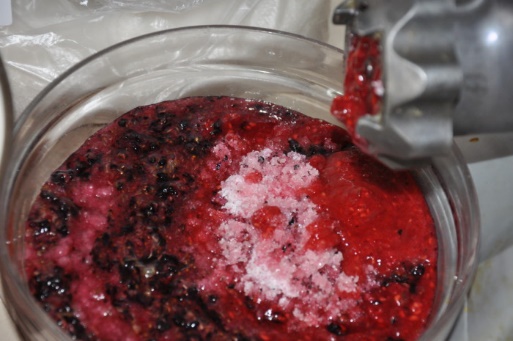 - La masa de bayas se muele a través de un colador fino, separando la torta. El jugo resultante se vierte en una sartén hecha de material neutro (vidrio, cerámica o esmaltado).