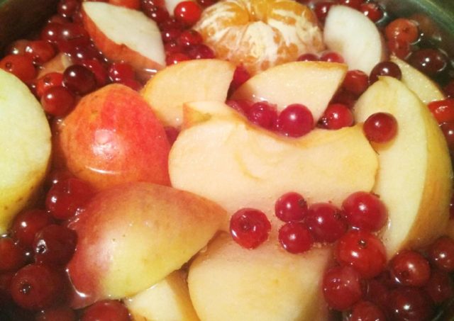- Enjuagar las frutas preparadas en un colador, dejar escurrir el exceso de líquido y pasar a un recipiente ancho esmaltado, llenar con agua filtrada y poner al fuego.