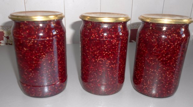 Mezclar todos los ingredientes y poner al fuego para que se evapore el exceso de líquido. Después de media hora, frote el puré de frambuesa a través de un colador. Lleve la masa resultante a ebullición, vierta en frascos. Enrolle la mermelada de frambuesa (gelatina) con agua hervida limpia y las tapas.