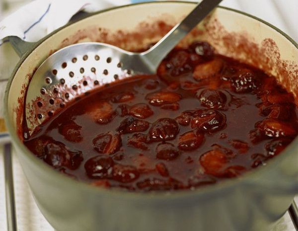 - En un recipiente refractario, la mezcla de frutos rojos se cubre con azúcar y se calienta a fuego muy lento, procurando que no hierva, durante un cuarto de hora.