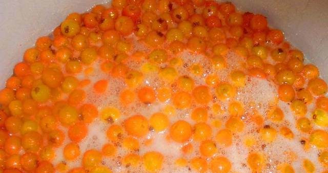 - El jarabe se hierve con agua y azúcar granulada, con lo que se vierten las bayas de espino preparadas y se dejan durante la noche.