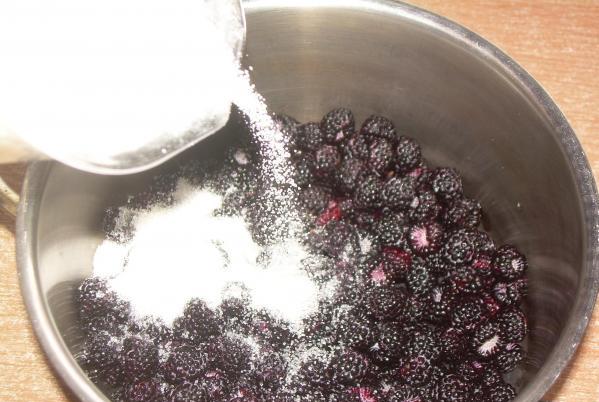 Para hacer la mermelada más espesa, se agrega gelatina a las frambuesas negras durante la cocción. El manjar resultante se puede usar como relleno para pasteles, ya que no es en absoluto propenso a extenderse.