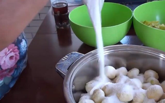 Los frutos se pelan y se lavan bien. Cortar por la mitad (si la fruta es grande) y pasar por una picadora de carne. Deje la mezcla triturada hasta que se libere el jugo. Cubrir con azúcar y agregar un par de gotas de jugo de limón. La cantidad de azúcar y jugo de limón se puede aumentar o disminuir al gusto.