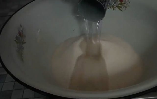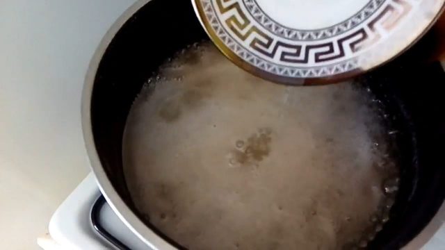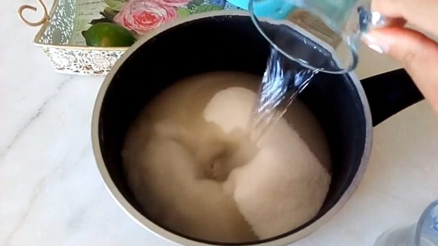 Revuelva el azúcar con agua. La cacerola se pondrá al fuego.