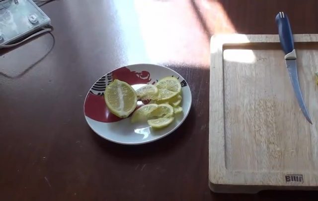 Mientras hierven los higos en el almíbar, cortan el limón.Se divide por la mitad, se quitan los huesos y la mitad se corta en rodajas.