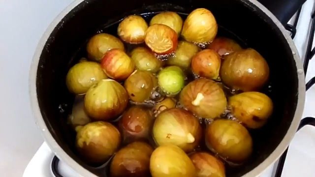 Tan pronto como el azúcar granulada se disuelva, se añaden al almíbar las bayas de higo peladas.