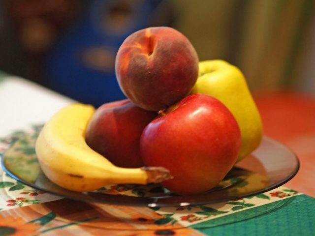 - Preparación: lavar bien todas las frutas, quitar las semillas de melocotones y ciruelas, pelar y quitar el corazón de las manzanas, pelar los plátanos.