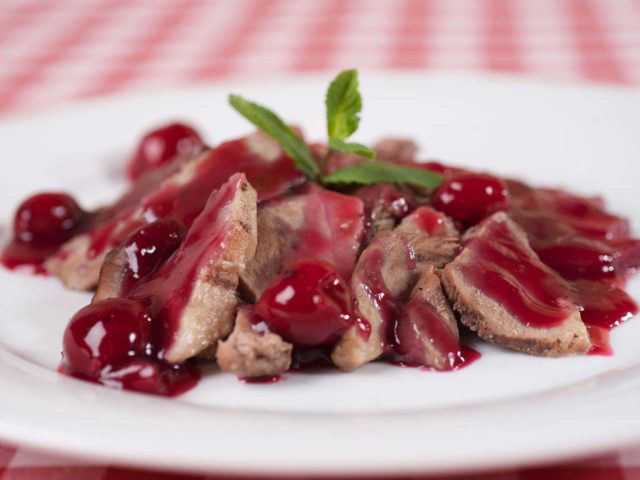 - Pasado este tiempo, retire las verduras y mezcle el caldo de cerezas con el jugo.