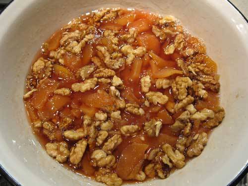 Cuando la mermelada hierva por tercera vez, vierta el caldo colado de la cáscara, la cáscara y el corazón del membrillo. Agregue las nueces y la pulpa de limón, revuelva bien. Dejar hervir durante 5 minutos, apagar el fuego y envasar en frascos esterilizados.