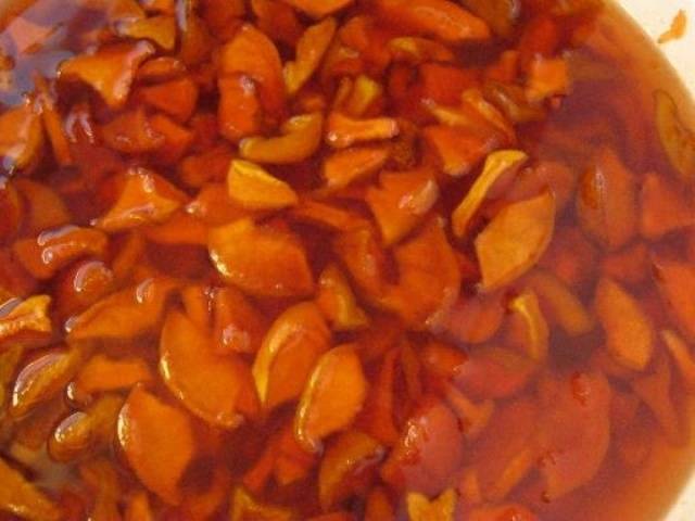 Vierta los desechos con agua, hierva durante 5 minutos. Colar, agregar el azúcar y hervir el almíbar.