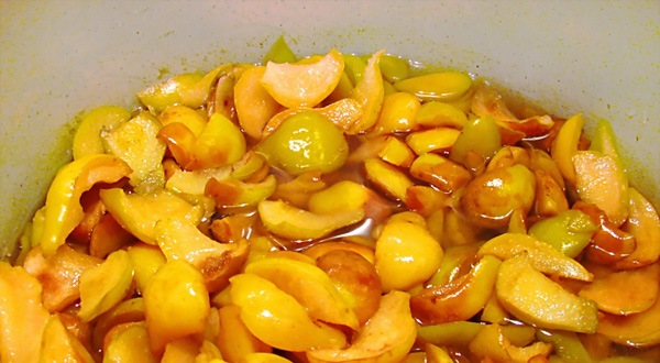 - Vierta las mitades de la fruta con almíbar caliente, agregue ácido cítrico y cocine a fuego medio durante aproximadamente media hora, removiendo y quitando la espuma resultante.