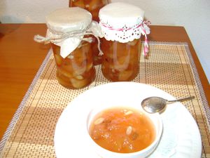 Usando la misma tecnología que se describe en detalle en la receta anterior, la mermelada de pera ámbar se cocina en rodajas con la adición de almendras.