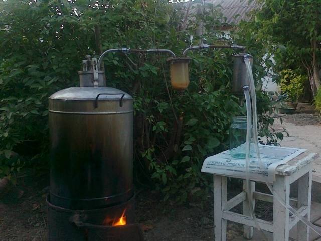 - Vierta la composición en un aparato de destilación y encienda un fuego pequeño. La fracción de cabeza debe salir en gotas, en total será el diez por ciento del volumen total. El "aroma" de la "cabeza" no es agradable y no se puede beber, al igual que las "colas".