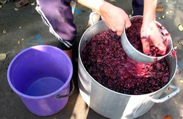 - La torta de uva que queda después de hacer vino o jugo se utiliza como materia prima. Bayas inmaduras o de calidad inferior, las crestas son imprescindibles para la preparación.