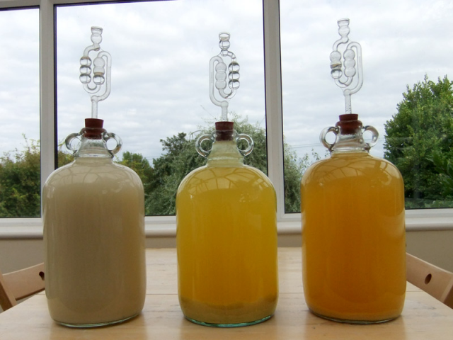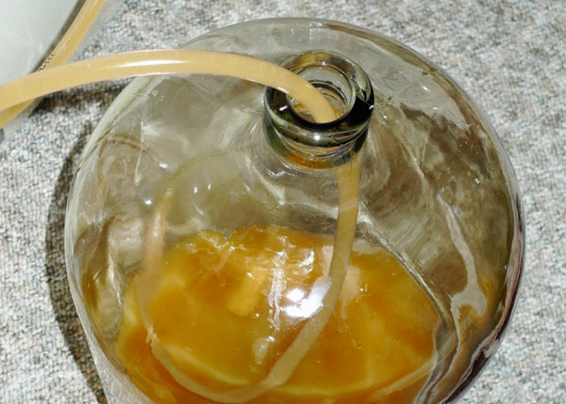 Cuando la lechada se asienta y el jugo se vuelve más liviano, se vierte en una botella de fermentación limpia a través de un sifón o tubo.