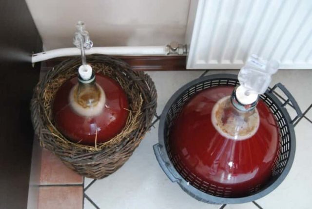 Para que continúe el proceso de fermentación, los recipientes con mosto se colocan en un lugar oscuro donde la temperatura se mantiene a no más de +18-20 grados. En todas las botellas es necesario pegar etiquetas con la fecha, una lista de las operaciones realizadas. Para aislar el mosto del aire, se instala un sello de agua en el cuello del recipiente. Es un tubo que se conecta al tapón de la botella en un extremo y se sumerge en un frasco de agua en el otro.