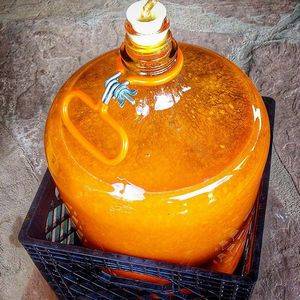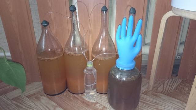 Después de 12-18 horas, después de la aparición de signos de fermentación (silbidos, espuma), se coloca un sello de agua en el recipiente con albaricoques o se coloca un guante de goma con un agujero. Sirve como indicador tanto del inicio como del final del proceso de fermentación. En levaduras naturales silvestres, el puré de albaricoque puede fermentar de 25 a 40 días. Un guante desinflado señalará el final del proceso. El puré en sí debe aclararse, un sedimento caerá en el fondo y el sabor se volverá ligeramente amargo sin el menor indicio de dulzura.