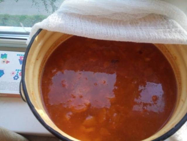 Coloque los albaricoques machacados con puré de papas en un recipiente de fermentación preparado, llénelos con agua y colóquelos en un lugar cálido.Tradicionalmente, el recipiente se tapaba con una toalla y se dejaba fermentar al sol, dejándolo afuera incluso durante la noche, si las noches no son frías (al menos +18). Pero para tener confianza en el proceso, puede colocarlo en un lugar oscuro y cálido de la habitación.