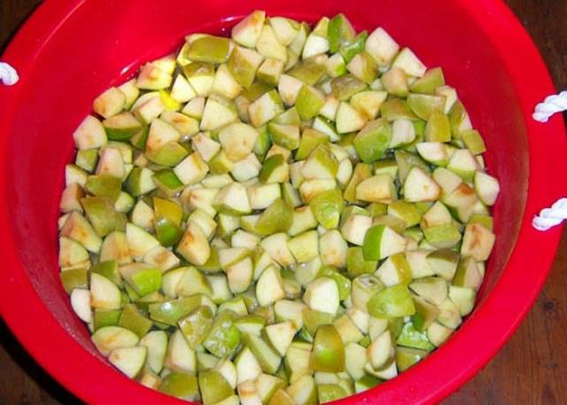 - Corta las manzanas en trozos pequeños y mézclalas bien con 1 kg de azúcar. Doble la mezcla resultante en un recipiente grande y cubra con agua. Cubrir el producto con un paño limpio y dejar actuar durante 5-6 días.