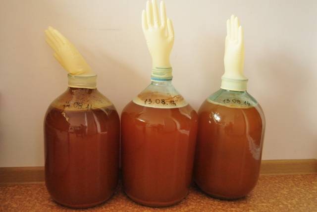 - Cuando el zumo de manzana empieza a "chisporrotear" y desprende un característico olor a vinagre, podemos hablar del inicio de la fermentación. En este momento, debe agregar una pequeña porción de azúcar (60-100 g por 1 litro de jugo) y verter el jarabe de la sartén en una botella (frasco), cubriéndolo con un guante de goma o una tapa con agua. sello. Es necesario llenar el recipiente con el mosto no completamente, dejando aproximadamente 1/5 del volumen total para la acumulación de la espuma resultante.