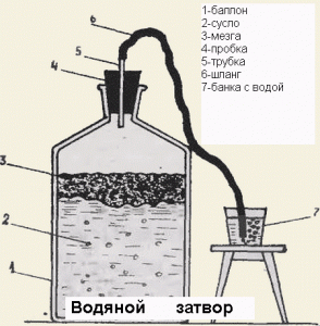 Todas las amas de casa que decidan hacer vino de manzana deben tener en cuenta las características enumeradas. También es necesario recordar que todo el proceso de fermentación, en el que se basa la elaboración del vino, debe realizarse en condiciones sin oxígeno. Por eso se recomienda llevar un guante de goma en el recipiente con el mosto. En uno de los dedos de una "cubierta" tan original, se debe hacer un pequeño orificio con una aguja. A través de este tonto, se eliminará el dióxido de carbono. La tapa con un sello de agua es todo un complejo de elementos que interactúan que eliminan el dióxido de carbono de la botella y no permiten que el oxígeno penetre en el recipiente. En la siguiente imagen se puede ver un ejemplo del funcionamiento de una cubierta de este tipo con un sello de agua.