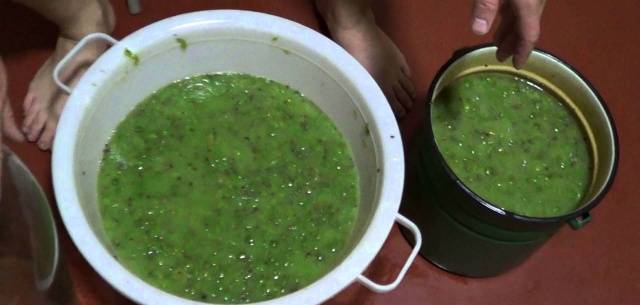 El jugo debe comenzar a fermentar al día siguiente, y es difícil pasar por alto este proceso: se forma una cabeza espumosa de pulpa en la superficie. Varias veces al día es necesario remover el jugo, disolviendo el tapón espumoso, usando un palito de madera o simplemente con la mano. Después de 3-4 días, la pulpa debe aclararse un poco, aparecerá un aroma peculiar y se escuchará un ligero silbido: esto es dióxido de carbono que sale. En esta etapa, el jugo debe exprimirse de la pulpa. La parte superior espumosa se retira con cuidado con un colador de plástico y se aprieta bien. Luego, la pulpa puede desecharse.