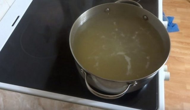 - Calentar todo hasta que hierva y hervir a fuego lento-moderado hasta que solo queden 9 litros de líquido en la sartén.