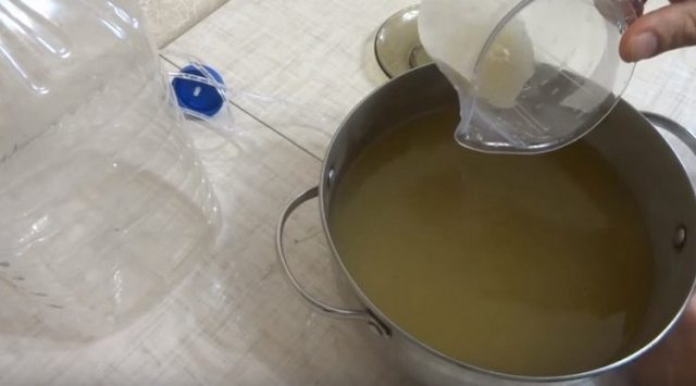 - La savia de abedul se calienta ligeramente a una temperatura de + 40-45 ° C y todo el azúcar se disuelve en ella.
