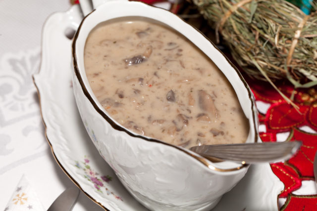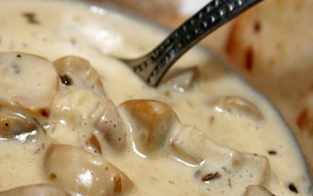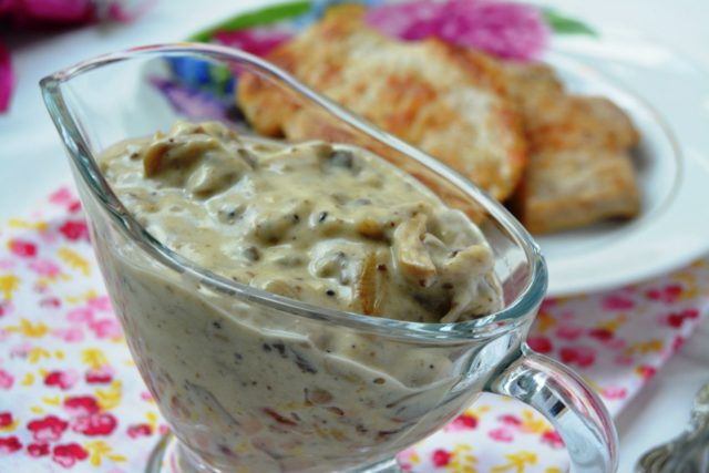 La salsa cremosa de champiñones se puede servir con carne y patatas.
