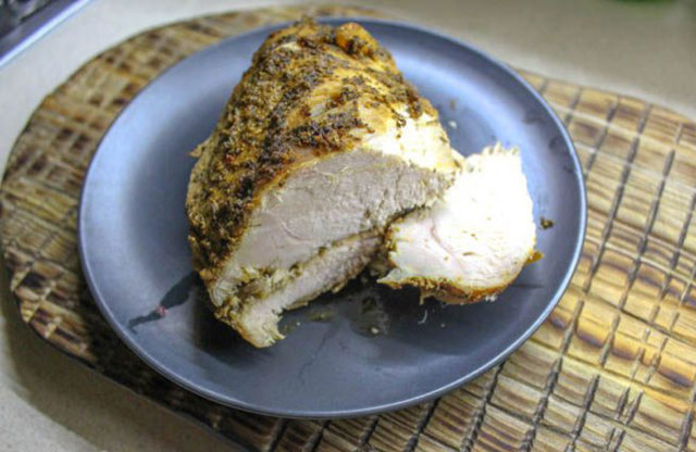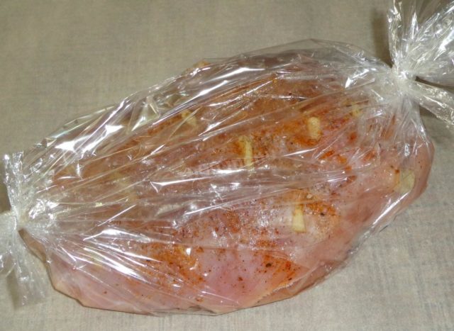 Antes de hornear, los filetes de ave se rellenan con ajo y se marinan en especias secas con la adición de aceite vegetal, miel y mostaza. Albahaca, orégano, pimiento rojo y negro, cilantro son especialmente adecuados para este caso.