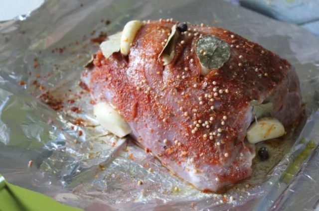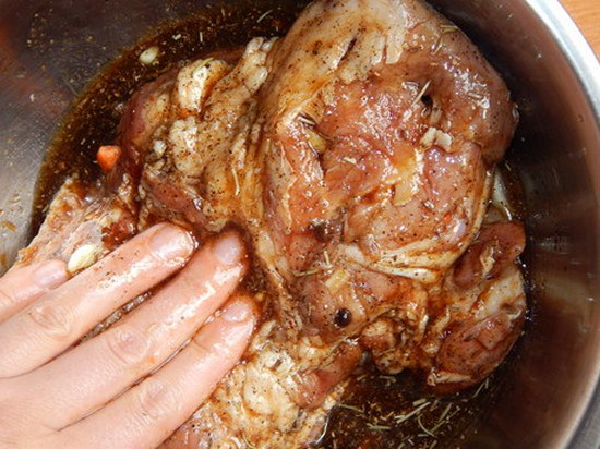 Se hacen pinchazos poco profundos en la carne con un cuchillo y se les inserta ajo. Exprime el limón y luego mezcla el jugo con sal, azúcar y mostaza. La masa resultante se frota cuidadosamente con la futura delicadeza y se deja marinar durante 2-3 horas.