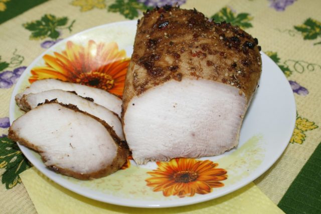 La pieza, lista para seguir cociendo, se limpia, se rellena con una pequeña cantidad de ajo y se cubre con una mezcla de condimentos de sal, pimienta y pimentón. Se vierte un poco de aceite de girasol en el fondo de la multicocina, se coloca la carne de cerdo y se cocina durante 15 minutos por cada lado en el modo "Freír". A continuación, vierta 50-100 ml de salmuera en el recipiente, cúbralo con una tapa y configure la función "Enfriamiento" durante otras 2,5 horas.