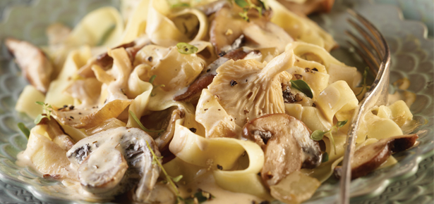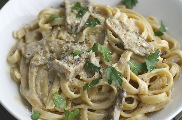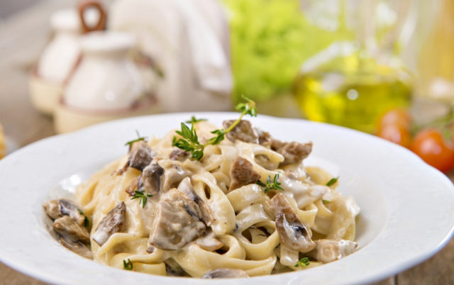Fettuccine es un tipo popular de pasta, fideos planos finos inventados en Roma. Los italianos suelen cocinar esta pasta con queso parmesano rallado y hierbas frescas, pero los champiñones se combinan mejor con una guarnición. El plato también se puede servir en una salsa de crema agria o cremosa.