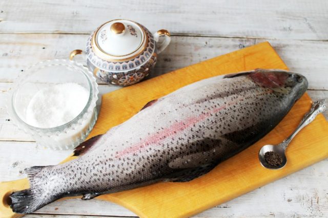 Una carcasa de pescado, rallada con especias, se envuelve en una envoltura de plástico, se coloca en un recipiente, se tapa con una tapa y se envía al frío. Al final de la salazón, las truchas se sacan del frigorífico, se lavan con agua y se secan.