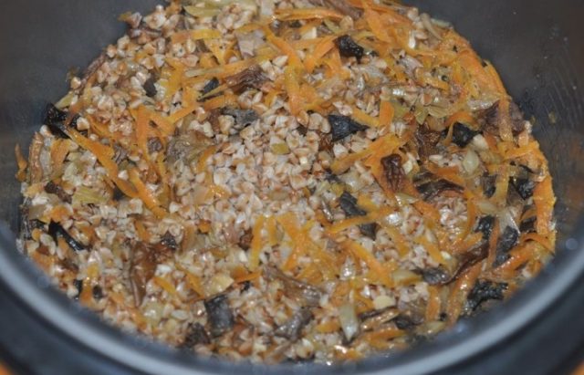 - Las cebollas y las zanahorias se fríen en una sartén separada con mantequilla. Después de estar listo, se agregan trigo sarraceno y champiñones a las verduras. Todo se mezcla y se deja debajo de la tapa durante 2-3 minutos.