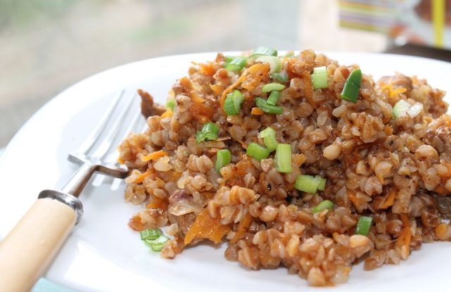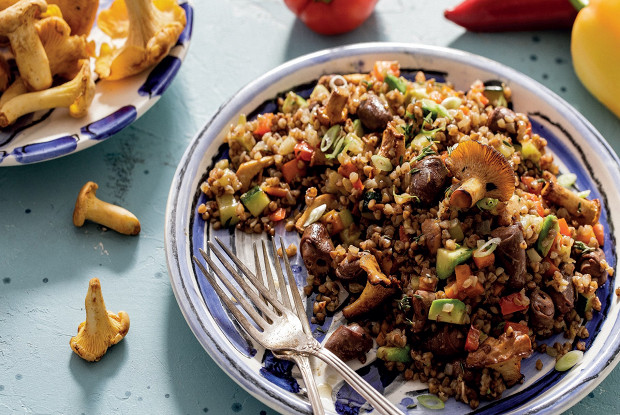 Los ingredientes disponibles se convierten en una delicia original con un agradable sabor a rebozuelos, verduras frescas y la suavidad de la papilla de trigo sarraceno.