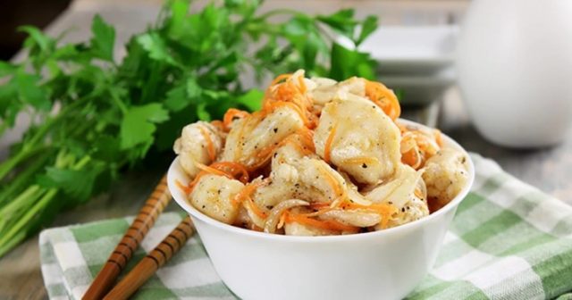 Lucioperca en escabeche se mezcla con zanahorias ralladas para ensaladas coreanas. A continuación, se prepara un relleno: el aceite vegetal al rojo vivo se mezcla con pimiento rojo y glutamato. La mezcla resultante se sazona con ensalada y se guarda en el refrigerador durante la noche.