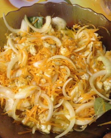 La berenjena y el pimiento se cortan en tiras grandes y se fríen hasta que estén suaves en aceite vegetal. La cebolla se pica en medias anillas gruesas, las zanahorias se rallan para je, el pepino se pica arbitrariamente. El pescado y las verduras se mezclan en un recipiente grande, se sazonan con salsa de soja y aceite vegetal. Puedes agregar sal y un poco de pimiento rojo al gusto. Lo ponen en el refrigerador durante la noche. El plato terminado se sirve frío.