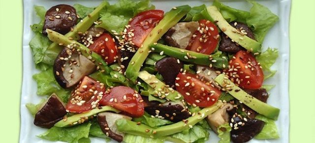 Hay muchas recetas de ensaladas secas de shiitake. A pesar de que este hongo nos llegó de China, va bien con muchos productos familiares en nuestro país: tomates, pimientos rojos y amarillos, aguacate, ajonjolí, ajo, etc.