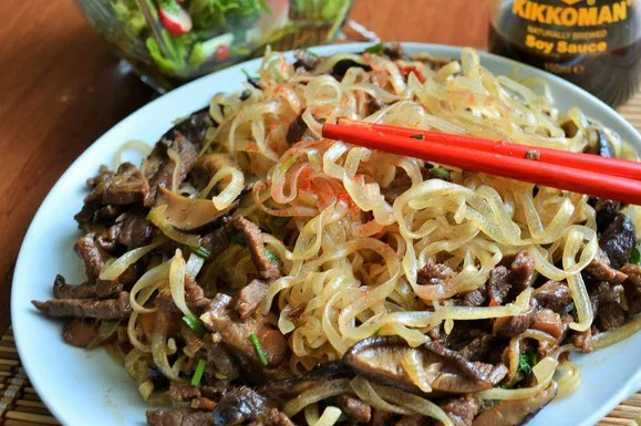 - Coloque los fideos de arroz en un recipiente y vierta agua tibia durante 4-5 minutos. Agregue los fideos preparados a los champiñones y la carne en una sartén y, revolviendo, deje el plato unos minutos más.