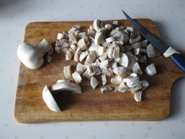 Es necesario cortar los champiñones correctamente. Después de todo, es el tamaño y la forma lo que afecta el sabor de su plato favorito. Puede moler con un cuchillo o pedir ayuda en un procesador de alimentos, un cortador de huevos o una trituradora eléctrica.