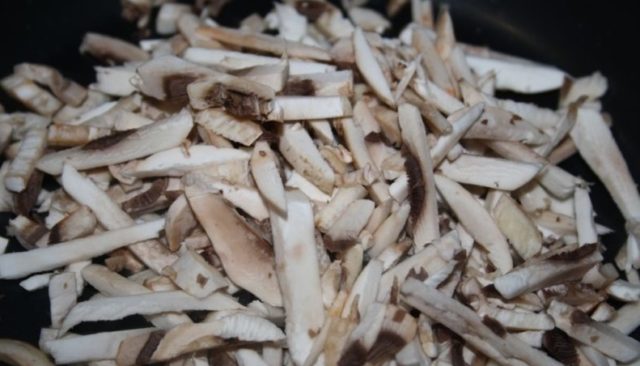 Puedes cortar los champiñones para freír en platos finos. En este caso, primero deberán freírse. Esto ayudará a eliminar el exceso de humedad de la fruta.