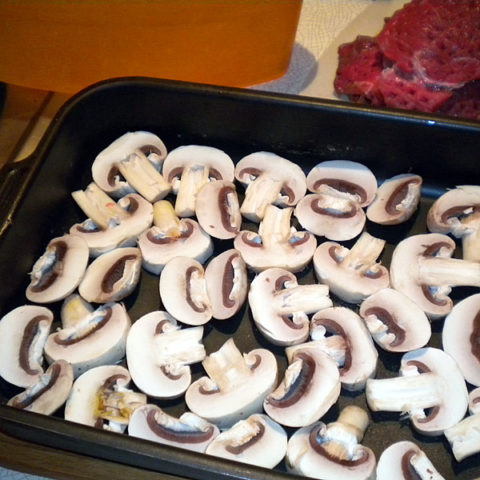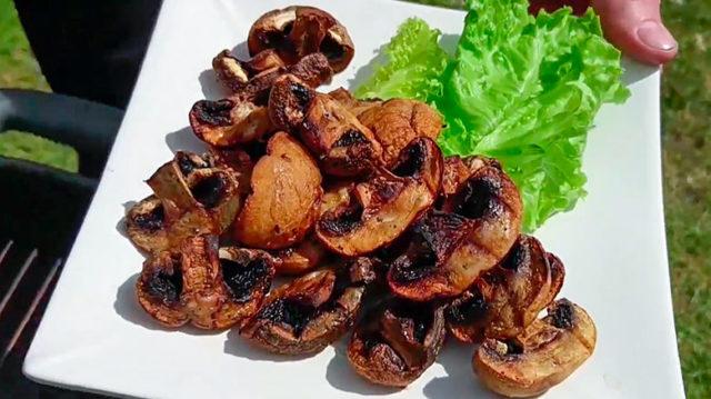 Es imposible cortar los champiñones para asarlos muy finos, de lo contrario se secarán rápidamente. Vale la pena triturarlos con platos gruesos.