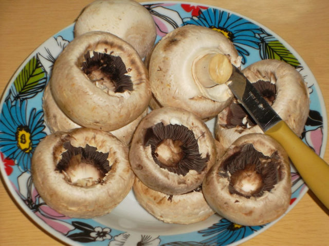 Si necesita preparar un aperitivo de champiñones relleno, debe cortar la pierna de los champiñones. Primero, retire la película que cubre la superficie del hongo. Después de eso, con la punta de un cuchillo bien afilado, corta la base de la pierna, que está dentro del capuchón.
